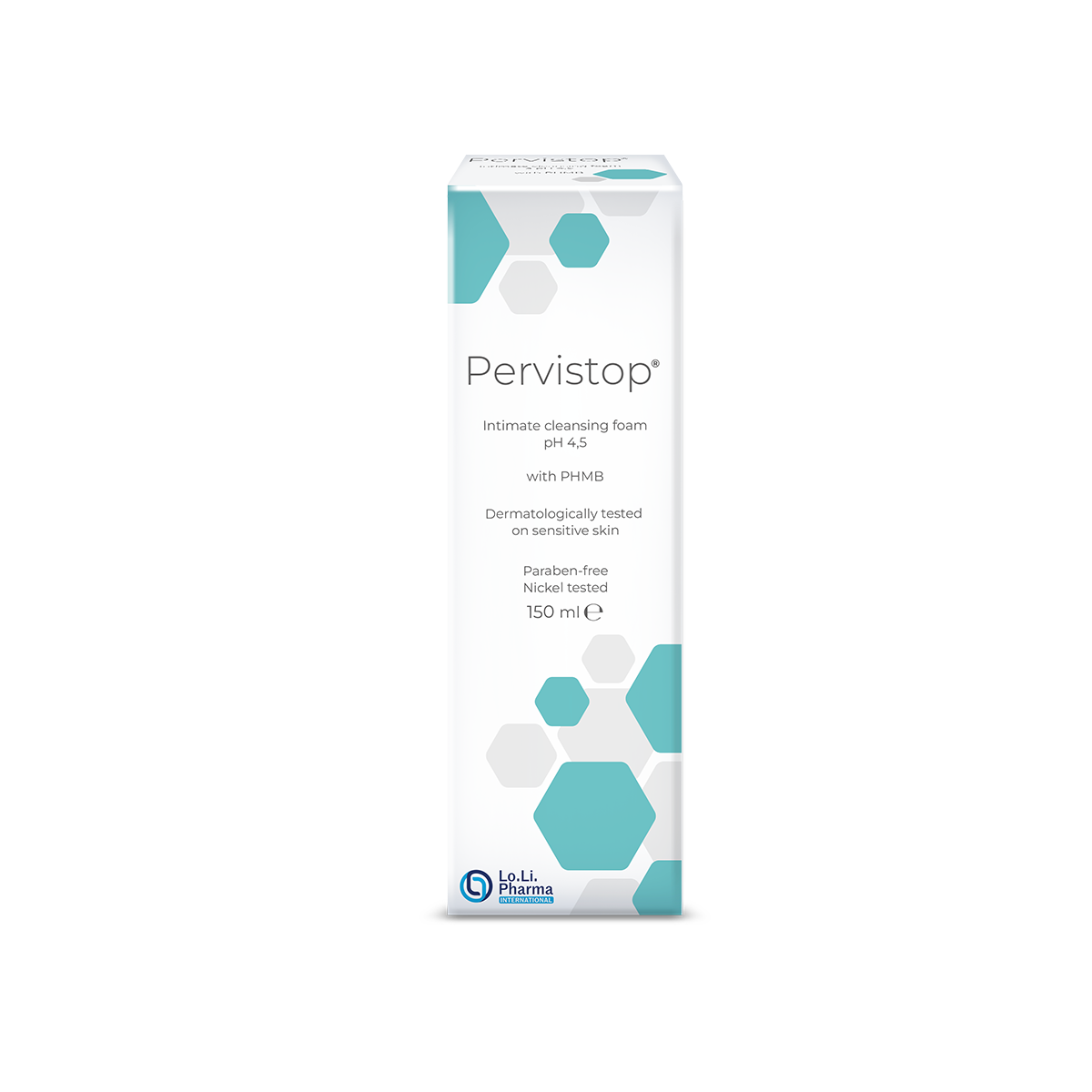 PERVISTOP® foam is a pH4.5 intimate cleanser with polyhexamethylene biguanide (PHMB) used for daily intimate hygiene for women and men. The functional substances contained in its formulation contribute to creating an environment unfavorable to the growth of microorganisms and carry out a hydrating, emollient, rebalancing, protective and soothing action, alleviating symptoms due to conditions that can cause irritation and redness. The pH 4.5 in PERVISTOP® cleansing foam promotes respect for the physiological intimate balance, ensuring daily well-being.