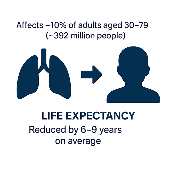 Beyond its respiratory impact, COPD significantly reduces overall life expectancy—by an average of 6 to 9 years—and poses a major global health challenge due to its high prevalence, chronic progression, and substantial burden on patients’ quality of life.
